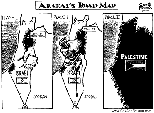 From the outset Arafat flouted practically every provision of a 1993 peace accord–most notably the provision to quell terrorism against Israel. The vast armed “police force” he created actually conspired with and often actively supported terrorists. And, calling for “martyrs by the millions,” Arafat fostered the deployment of suicide bombers. In 2001 he told the family of one bomber: “The heroic martyrdom operation [of the man] who turned his body into a bomb [is] the model of manhood and sacrifice for the sake of Allah and the homeland.”