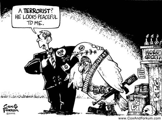 Since his airlift to a Paris hospital, as the welcomed guest of the French government and with throngs of journalists on the scene, Arafat’s death has been presented as the heartbreaking end of a noble man. Reacting to a premature report of Arafat’s death, President Bush wished that “God bless his soul.” Upon Arafat’s death, Jacques Chirac lauded him as “a man of courage and conviction.” The French gave him a military salute as Arafat’s coffin was sent to his funeral in Egypt, which many heads of state are expected to attend.