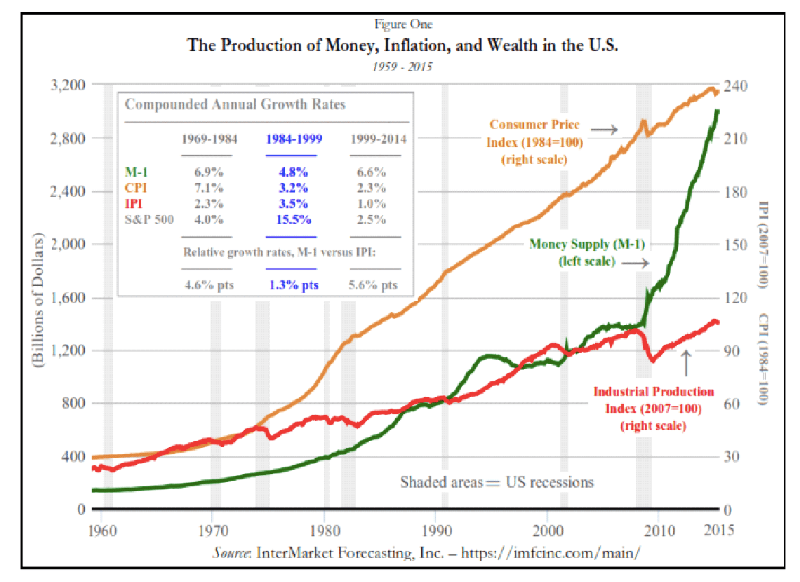 Figure One can help make the point by illustrating the empirics of money, inflation, and production in the U.S. since 1959.