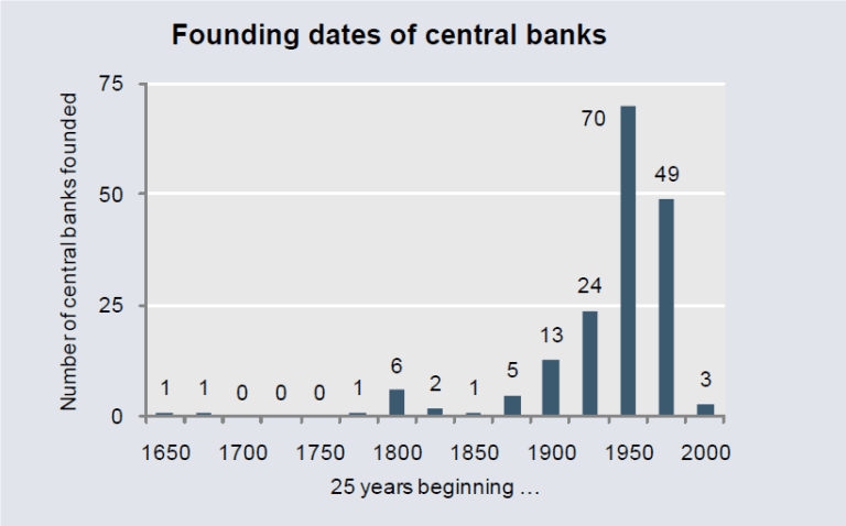 Let’s start with the easy part: Greg Ip’s claim that “Even on gold, central bankers still had to decide interest rates.” That claim would have merit if all the nations that took part in the classical gold standard (1871-1914) had central banks. In fact, most didn’t. As the following chart, reproduced from a BIS publication, shows, the vast majority of today’s central banks were established after the classical gold standard era. Gold standard nations that lacked central banks throughout the classical gold standard era included the United States (one of the “core” nations), all of the British Dominions save Australia (which only established a central bank in 1911), Greece, Turkey, the Philippines, Thailand (Siam), and all of Latin America. Because the Swiss National Bank wasn’t up and running until 1907, Switzerland also lacked a central bank for most of the classical gold standard era.