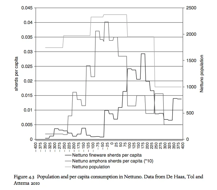 Jongman’s chapter provides evidence of intensified coal production, pollution, building construction, and animal consumption. I’ve reproduced one of his figures. It depicts the rapid increase in pottery shards from Netturo (approximately 50 km south of Rome) in these centuries.