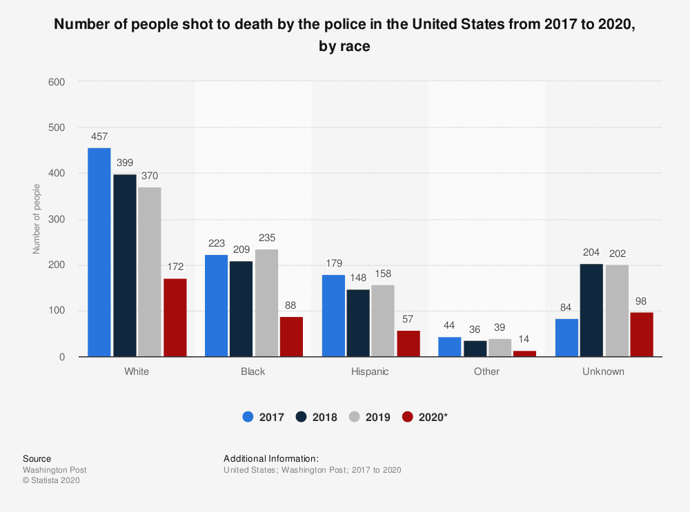 [21] Especially if they are male as over 90% of unarmed people killed by police are male. (See “Fatal Force: Police Shootings Database.” The Washington Post, 22 Jan. 2020.) Which for cherry-picking statisticians, who examine the forest while ignoring the trees, would be grounds to declare that the police are systematically sexist.