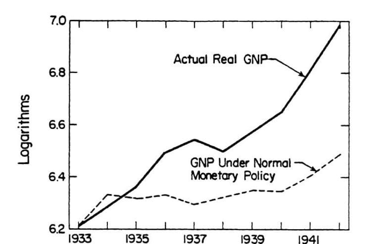 According to Romer’s calculations, illustrated in the chart below, if instead of growing exceptionally rapidly the U.S. money stock had only grown at its average historical rate, “real GNP would have been approximately 25 percent lower in 1937 and nearly 50 percent lower in 1942 than it actually was.”