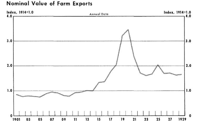 But WWI would indirectly do even greater harm to the banking system. Because the war shut-down many European farms, and troops needed to be fed, crop and livestock prices rose sharply, encouraging U.S. farmers and ranchers to extend their acreage. Then, when the U.S. entered the war, the Agricultural Extension service egged farmers on further with a vigorous campaign aimed at getting them to contribute to the war effort by farming more intensively with the help of tractors and new methods of pest and weed control. More new banks popped up in turn to finance farmers’ purchases of land and tractors and other inputs using credit secured by mortgages. Between them, subsidized deposit insurance and the WWI farm boom caused the number of banks to more than double, from 12,427 in 1900 to 30,291 by 1920. Bank lending to farmers itself doubled between the start of the War and 1920.