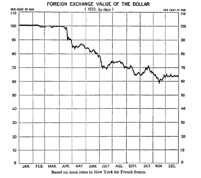 In his famous December 1933 open letter to the New York Times, Keynes offered a further explanation for the gold purchase program’s failure to draw gold to the U.S. “The recent gyrations of the dollar,” he said, “have looked to me more like a gold standard on the booze than the ideal managed currency of my dreams.” They presumably looked that way to others as well. Here, from the 1934 Federal Reserve Board Annual Report, is a chart showing what they looked like to a Frenchman: