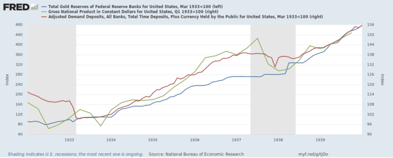 With most American gold safely ensconced in the Fed’s vaults, and strict limits placed on gold exports, the Great Contraction was over. But as we’ve seen, recovery from that contraction would take place only once the gold that had fled the U.S. during the depression started flowing back to it.