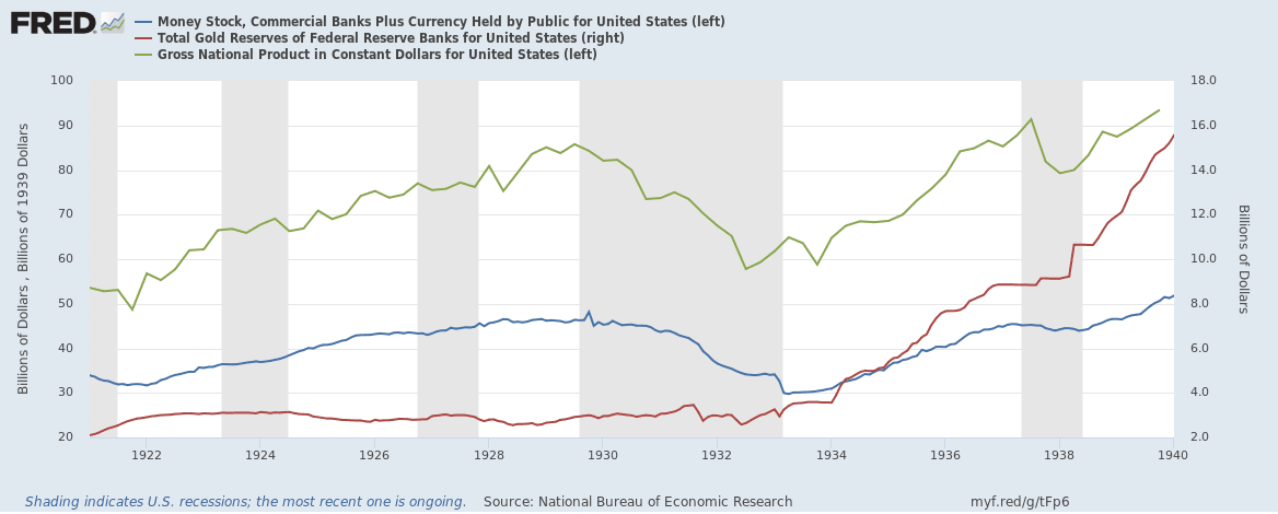 As I pointed out several installments ago, the recovery that followed FDR’s assumption of office was fueled almost exclusively by growth in the Federal Reserve’s gold holdings. As the following FRED chart shows, those holdings almost tripled during the four years following the nationwide bank holiday, allowing the M2 money stock to concurrently grow to 150 percent of its pre-holiday level. The result was a “Great Expansion” of real GNP that more than offset the “Great Contraction” of the preceding three years.