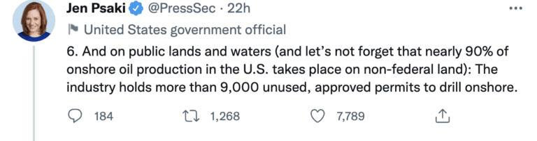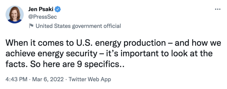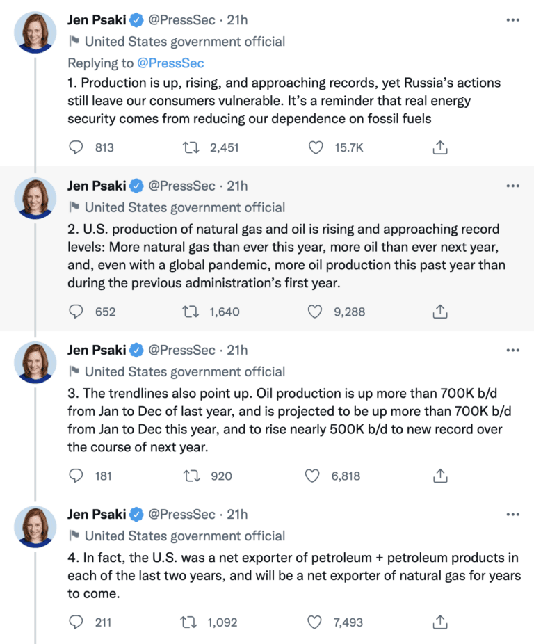 The White House is feeling the pressure of its anti-North American energy policy and on Sunday afternoon, Jen Psaki, the White House Press Secretary again took to Twitter to try to argue that U.S. domestic oil production does not really matter.