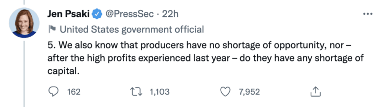 Also, as David Blackmon, Senior Contributor at Forbes explained just last month, “Also limiting any response is the reality that many big producers remain intimidated by no-growth pressure from the ESG investor groups like BlackRock.” To understand this, Ms. Psaki should ask fellow high-ranking White House staffer Brian Deese, the current Director of the National Economic Council and former Global Head of Sustainable Investing at BlackRock.
