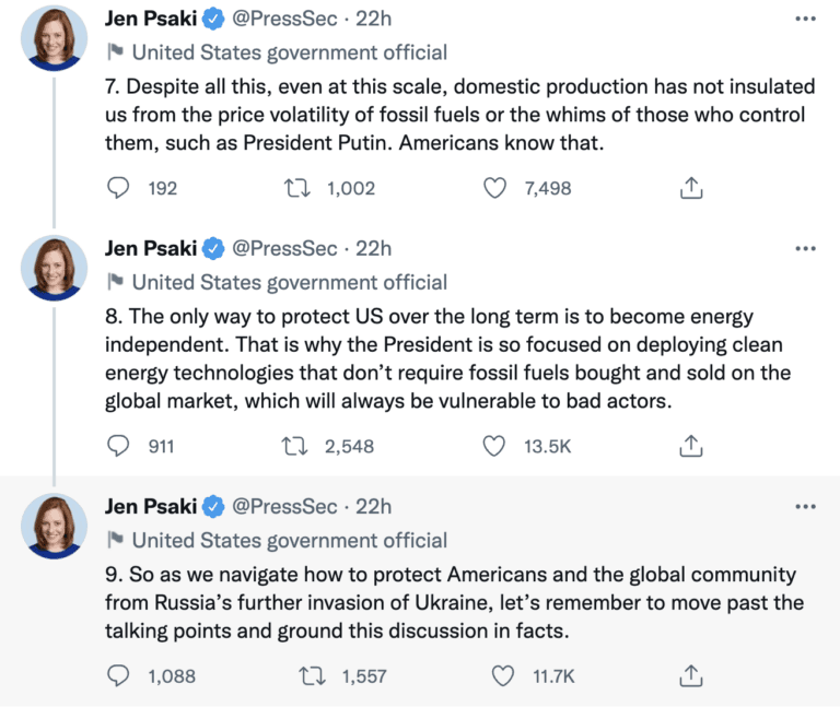 Press Secretary Jen Psaki did as good a job as she could do to spin the Biden administration’s anti-energy agenda. The reality is that the United States has greater energy security today because of dramatically higher domestic oil and natural gas production and not because of European-style subsidies and mandates for renewable energy that led to their energy weakness currently being exploited by Russia. Now only that, but the European-style energy policies the administration wants to pursue would make the United States far more dependent on China than we have ever been on oil from OPEC.