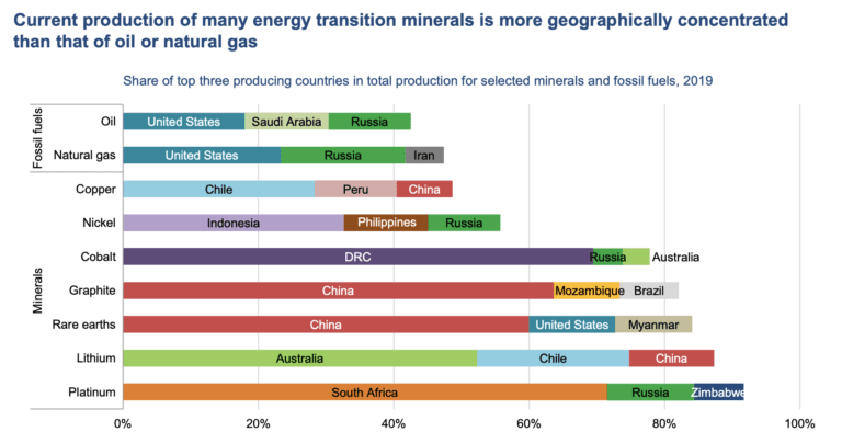 The production and processing of that are necessary for these “clean energy technologies” are far more geographically concentrated than oil and natural gas production as the International Energy Agency illustrated with this chart last year: