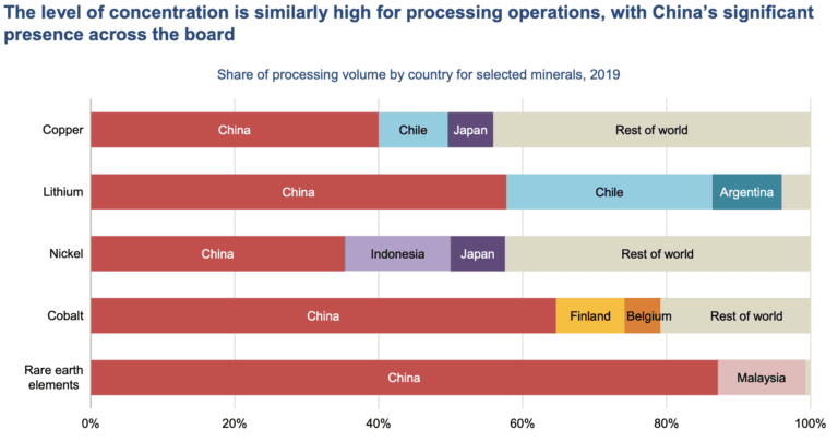In terms of processing the minerals necessary for things such as batteries and electric vehicles, China far surpasses other countries. China dominates the rest of the world in copper, lithium, nickel, cobalt, and rare earth processing.