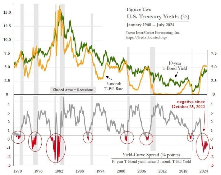 Figure Two shows that the most recent inversion has lasted longer and has gone deeper (a more negative spread) compared to all prior recessions except those of the early 1980s. Historically, the longer and deeper has been the initial inversion, the longer and deeper has been the subsequent recession. Sadly, this latest inversion is nearly “off the chart.” Moreover, it’ll likely persist for the balance of this year, as the Fed further delays (or minimizes) rate-cutting. As such, the recession could be relatively long, lasting well into 2025, perhaps even into 2026. The Great Recession lasted nineteen months; that same interval from here brings us to March 2026. The inordinately wide yield spread (deep into negative territory) also suggests that the magnitude of the coming output contraction could be larger than normal.