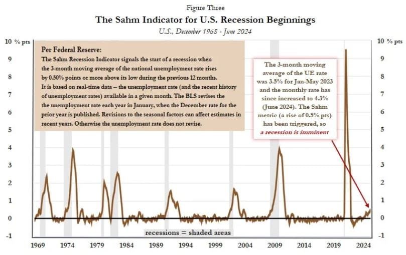 Figure Three plots the status of Sahm’s indicator since 1968. The recently reported US jobless rate was 4.3 percent (for June), which is more than 0.8 percent points above the previous low rate (from early 2023) of 3.5 percent. The Sahm threshold has been breached. This signal is effective because once the jobless rate rises by such a degree over a brief period, it rarely reverses. If indeed recession takes hold, the jobless rate keeps rising until after a recovery occurs.