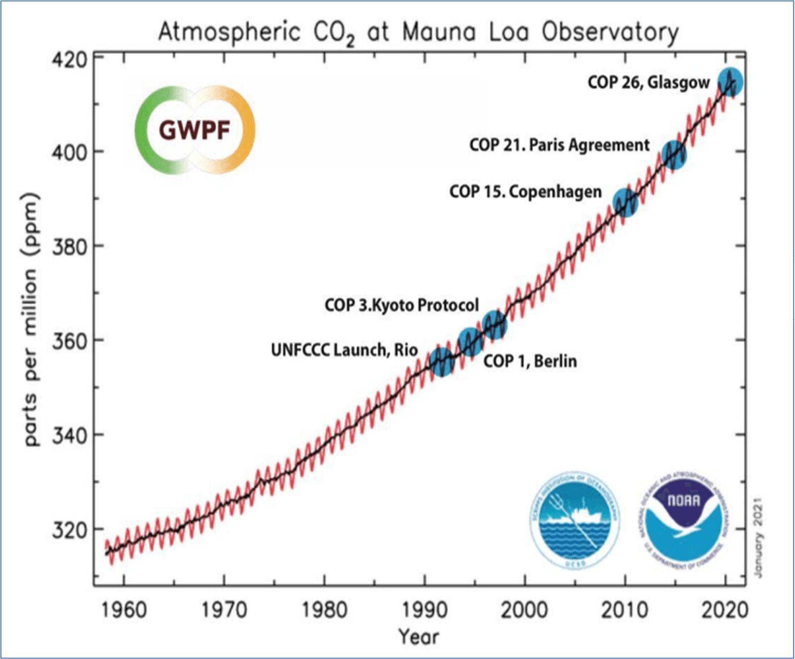 [24] The chart in Figure 10 was copied from a slide presentation (Christy 2021). The chart was produced by the Scripps Institute of Oceanography and the National Oceanic and Atmospheric Administration (NOAA). The Global Warming Policy Foundation (GWPF) added its logo, and notations of the UN policy conferences and international agreements to the Scripps-NOAA chart.