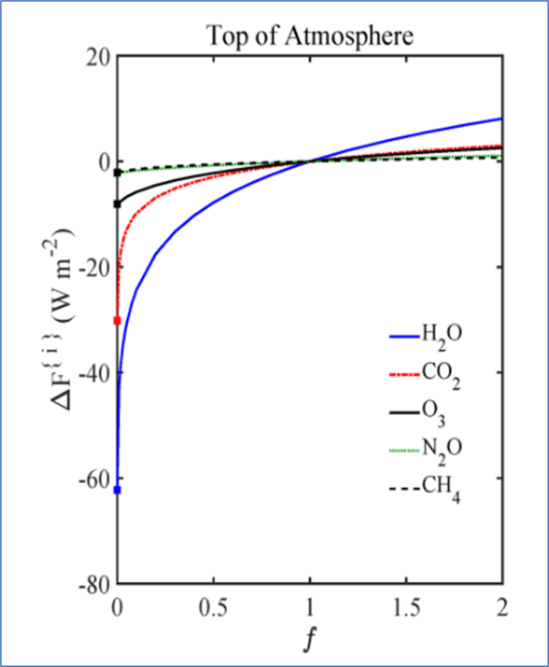 The authors obtained this result using the well-proven Schwarzschild[12] equation to calculate the flux of Earth’s radiant energy escaping to outer space for specified concentrations of GHGs in the atmosphere. The calculations used HITRAN[13] – a database of high-resolution spectrographic data that quantifies how gas molecules in the atmosphere absorb and emit radiant energy. The Schwarzschild equations were solved using the HITRAN data for the five most significant GHGs. The authors solved the Schwarzschild equations for each discrete spectral line (discrete frequency) in the spectrum of Earth’s radiant infrared energy as described by the HITRAN database for each of the five GHG molecules. Solutions were combined to form a computerized line-by-line mathematical model that calculates Earth’s cooling radiant flux and radiant intensity at the outer edge of Earth’s atmosphere for several simulated atmospheric concentrations of the five GHGs.