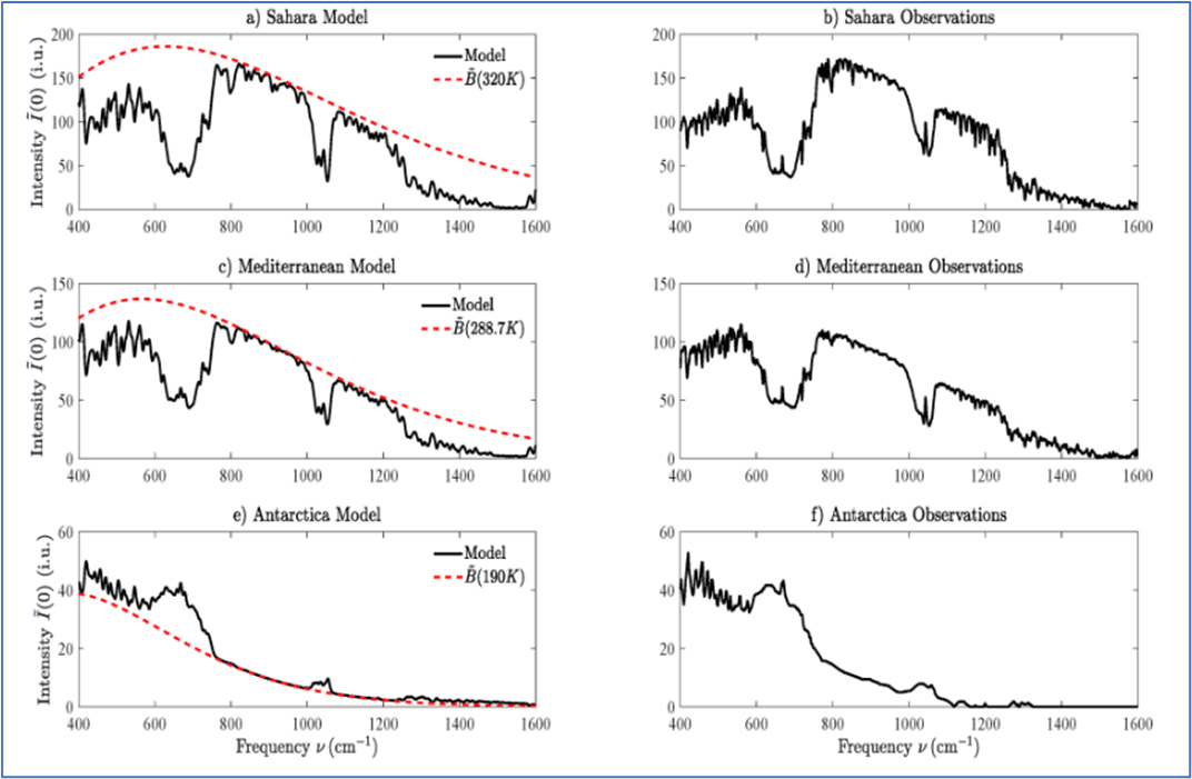 [15] Radiant flux in Figures 2, 3, and 4 is expressed as the radiant power per square meter (Watts per square meter or W/m2). The intensity unit in Figure 5 is the radiant power expressed in intensity units, defined as milliwatts per square meter per solid angle steradians (mW / m2 / sr), for each discrete frequency ( cm-1). Both flux and intensity are expressions of the power (or rate) of energy transfer from matter.
