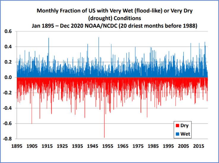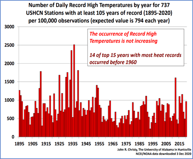 Historical charts of extreme weather in the US since 1895 (Figures 7 and 8) were prepared and presented by Dr. John Christy in a lecture (Christy 2021) from weather records maintained by NOAA. Dr. Christy (who is a PhD-trained meteorologist as well as a climate scientist) advises that the US has reasonably accurate data going back to 1895. Since that time, as the UN and NASA reported, global temperature has risen about 1.07°C. Americans were undoubtedly affected by the extreme weather charted in Figures 7 and 8.