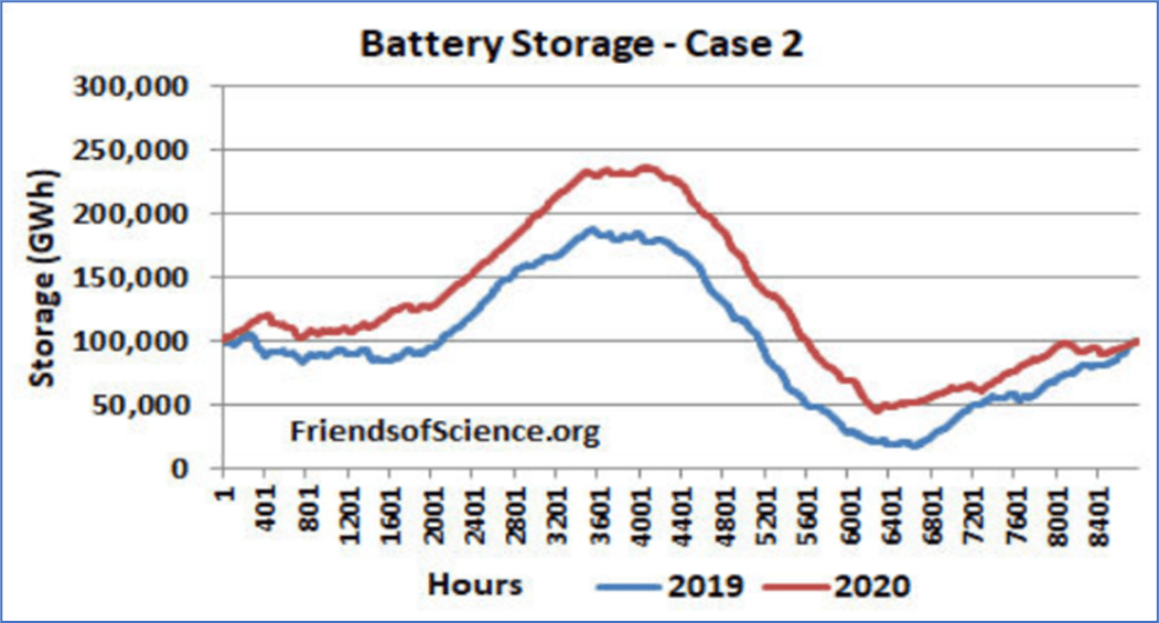 Figure 9 (a copy of Figure 5 in Mr. Gregory’s publication) shows how much electrical energy must be stored in grid batteries for the entire US when wind and solar output are near maximum, to be fully discharged when wind and solar output are near minimum. (200,000 GWh equals 200 billion KWh.)