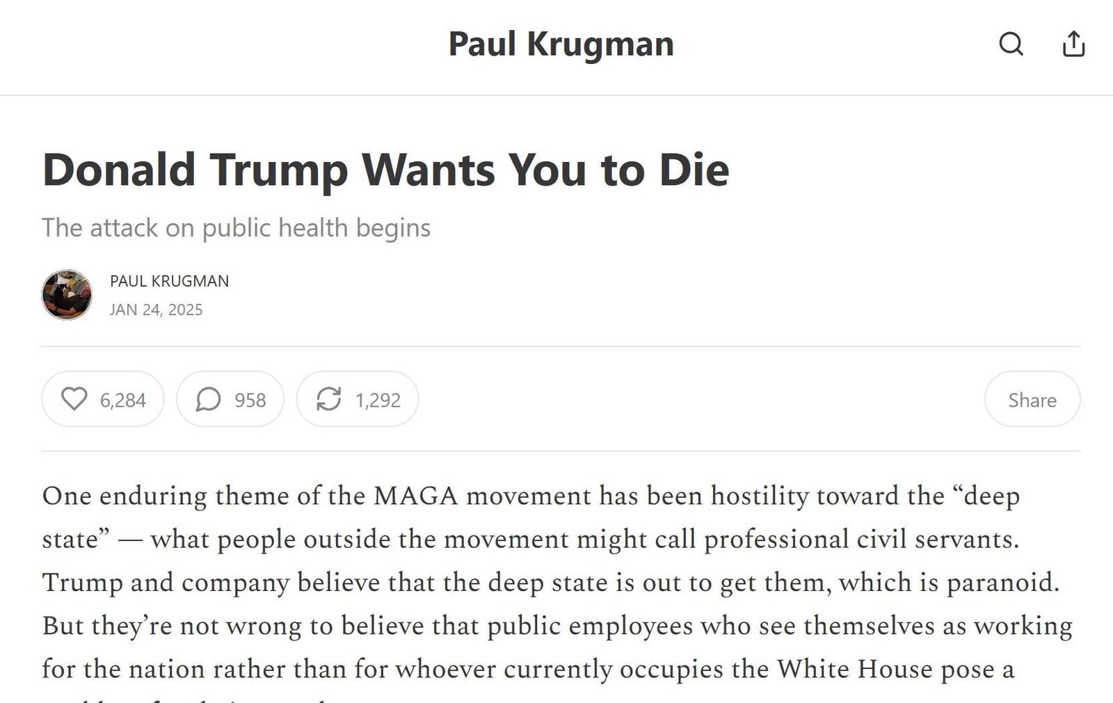 It is certainly not the case that Donald Trump wants you to die, contrary to Paul Krugman’s claim. No longer writing at the New York Times, he reserved his rather extreme view for his Substack account.