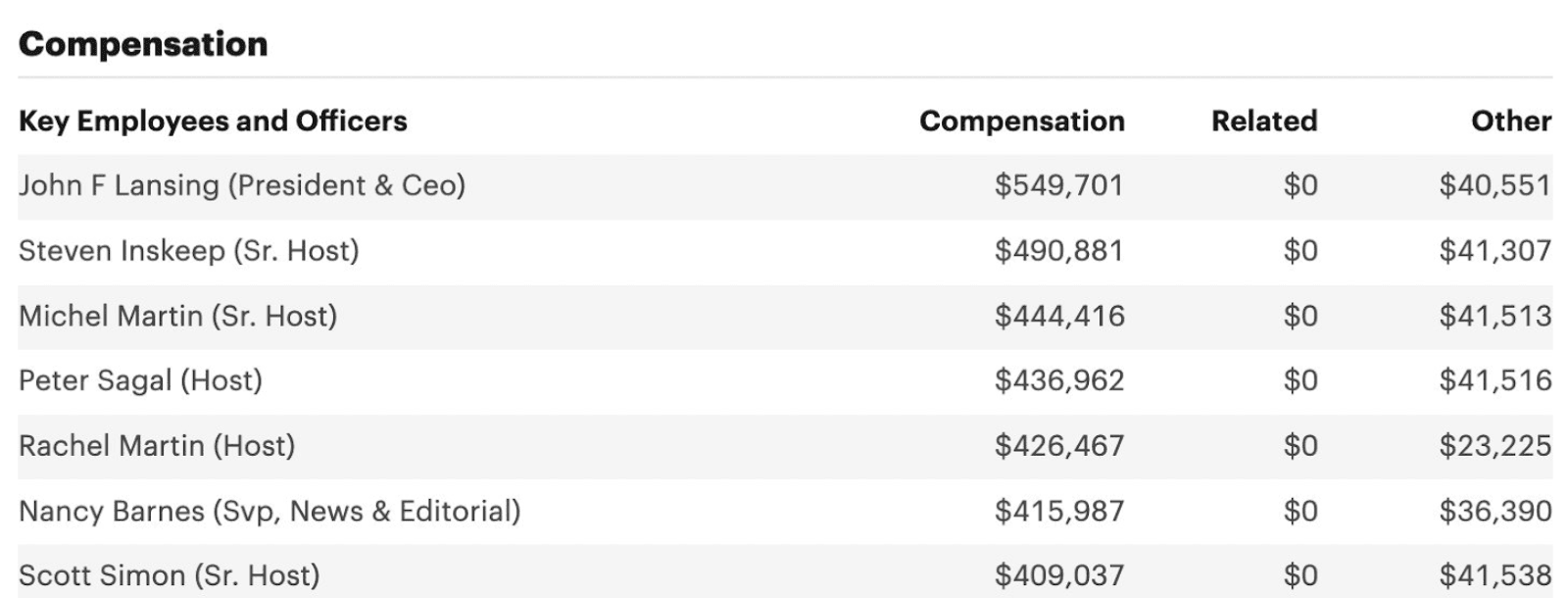 Again, this may not make a massive dent in the federal deficit, but few would deny there’s something unseemly about taxpayers ponying up their hard-earned dollars so NPR can pay hosts $500,000 salaries.