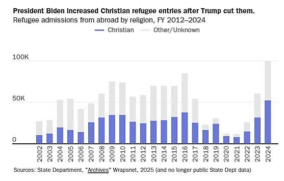 There were many other refugee arrivals of different Christian denominations and other religions, including Islam, Judaism, and Hinduism. However, for Christian refugees, the numbers show that far more were admitted by Presidents Obama and Biden than by President Trump. (In Biden’s final year, nearly 30,000 Christian refugees from 50 countries were admitted into the US, reported World Relief.)