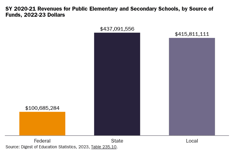 US ED spending constitutes a relatively small part of all education funding. In the 2021–22 school year (the latest with available data) all educational institutions in the United States spent $1.64 trillion, or $1.84 trillion in 2024 dollars. Appropriations for the US Department of Education in fiscal year 2024 were about $188.6 billion, or 10.3 percent of the total. Remove new Direct Loans for college students, which are supposed to be repaid, and the US ED budget was $97.0 billion, or just 5.3 percent of the total. Looking at the latest available (2020–21 school year) public elementary and secondary school revenues by source of funds, federal dollars account for slightly over 10.6 percent of the total.