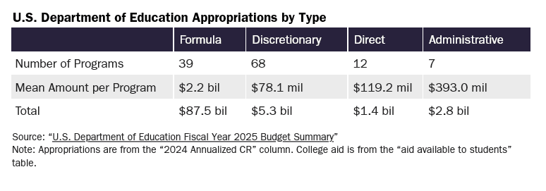 Formula grant programs are less numerous than discretionary but involve more money, largely because they include the primary funding under major laws, such as the Elementary and Secondary Education Act (ESEA) and the Individuals with Disabilities Education Act (IDEA). This includes $18.4 billion in grants to states through Title 1 of the ESEA and $14.2 billion in IDEA state grants. The biggest formula grant program is Pell Grants for college students, at $35.5 billion in FY 2024. The highly dubious 21st Century Community Learning Centers program, which garnered $1.3 billion, is also a formula program.