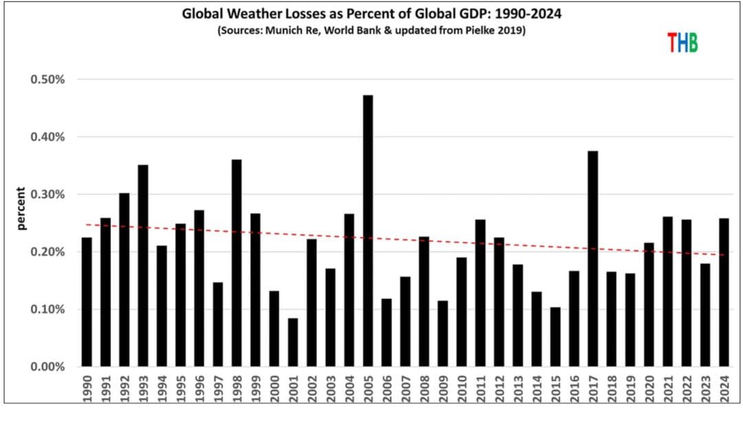 Not only have climate-related disaster deaths decreased, but GDP-adjusted climate-related damages are flat despite many incentives for them to go up (preferences for riskier areas, government bailouts).3