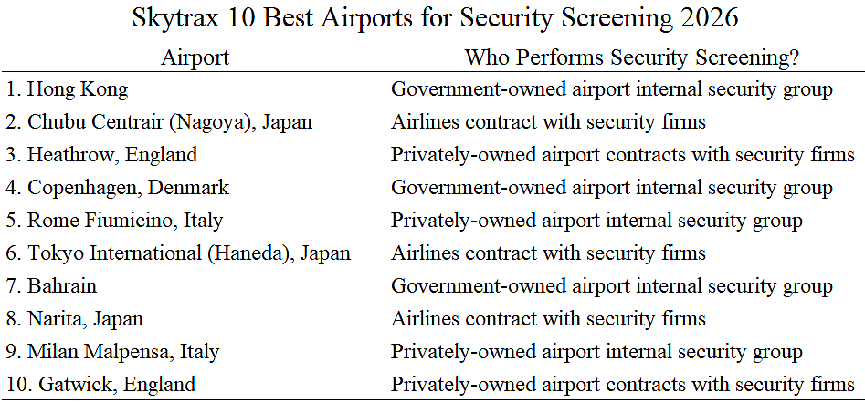 The table shows the Skytrax top 10 with my notes on the screening structures. In Japan, airlines generally contract with security firms for screening, although the government apparently will be moving the responsibility to the airports. In Europe, airports generally conduct screening in-house or contract with security firms. In Japan and Europe, many airports are partly or fully privatized.