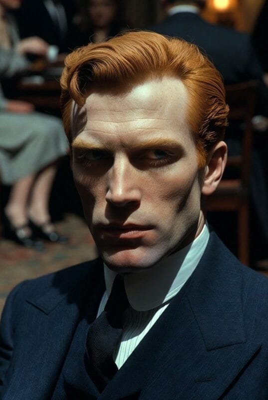 By the time we meet him at full success, the transaction is nearly complete. Watch how he moves through scenes: he enters a room and immediately begins scanning—not for what interests him, but for what the room requires of him. What face should he wear? What is expected? Who holds the most status and how should he orient toward them? This scanning is not social intelligence. It is the only form of navigation available to someone who has no internal compass. He is perpetually looking for his reflection in other people’s eyes because that is the only place he exists.